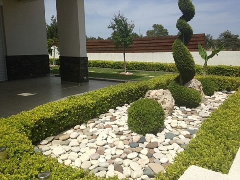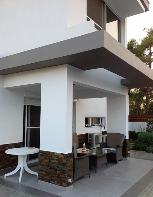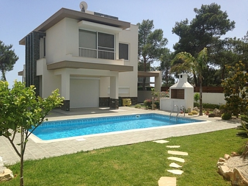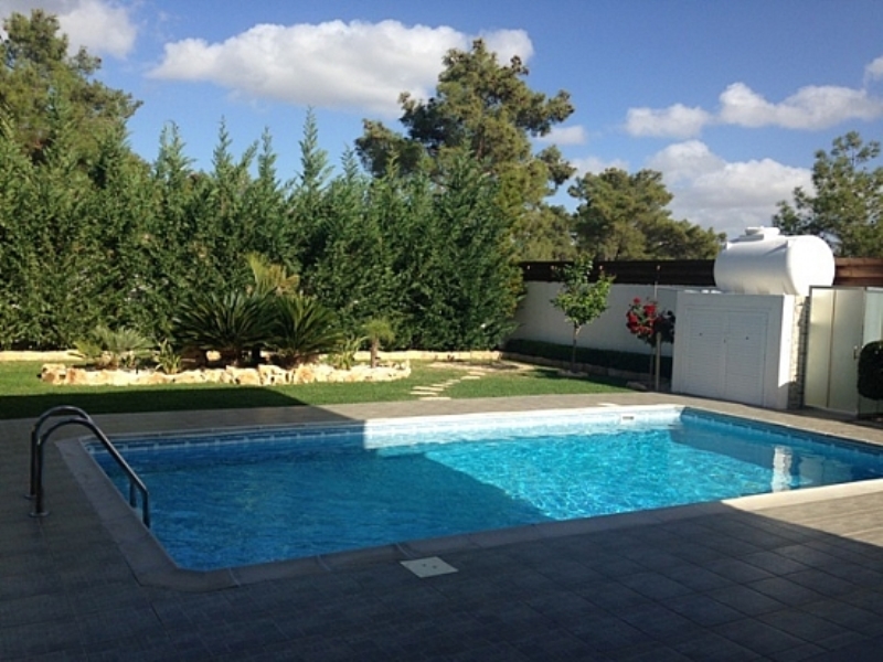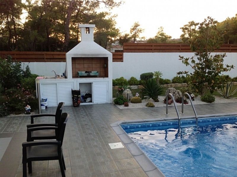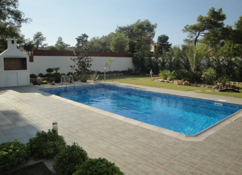 Территория виллы окружена хвойными деревьями. Участок облагорожен, разбит сад с цветущими растениями, перед домом бассейн и зона отдыха с барбекю.