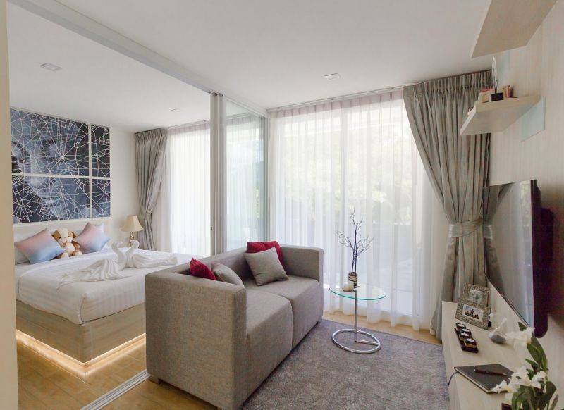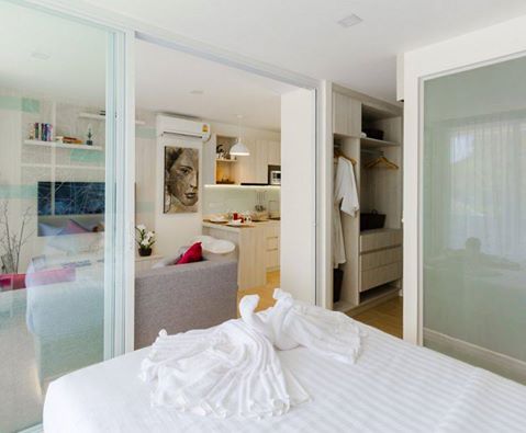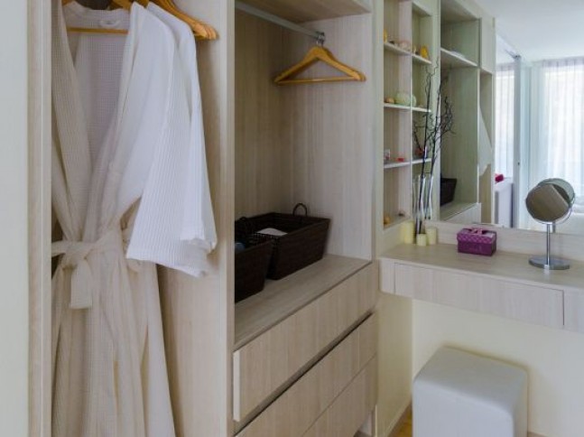 Во всех апартаментах большой удобный балкон и гардеробная. Даже в односпальных апартаментах гостиная зона от зоны спальни отделена стеклянными раздвижными дверьми, что очень удобно, если вы отдыхаете с маленькими детьми.