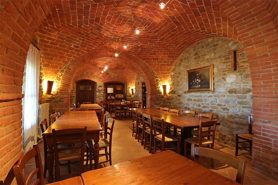 G.F. – an entrance, a lounge (current restaurant with premises characterized by beautiful brick vaults), equipped kitchen, a pantry, service WC; on the same level there is an apartment with a private entrance consisting of a living room with fireplace and a kitchenette, a hallway, 2 bedrooms, a bathroom plus a large porch of 60 sqm placed on the same side as the restaurant hall;