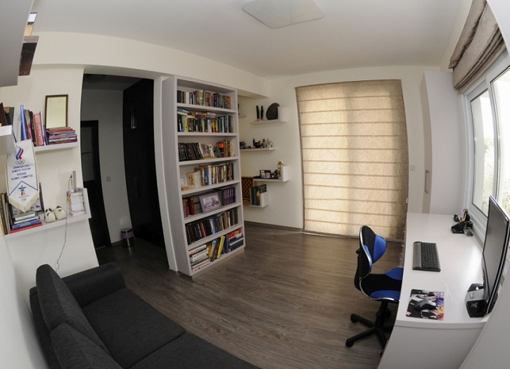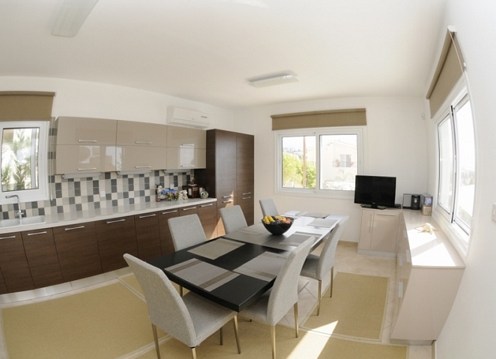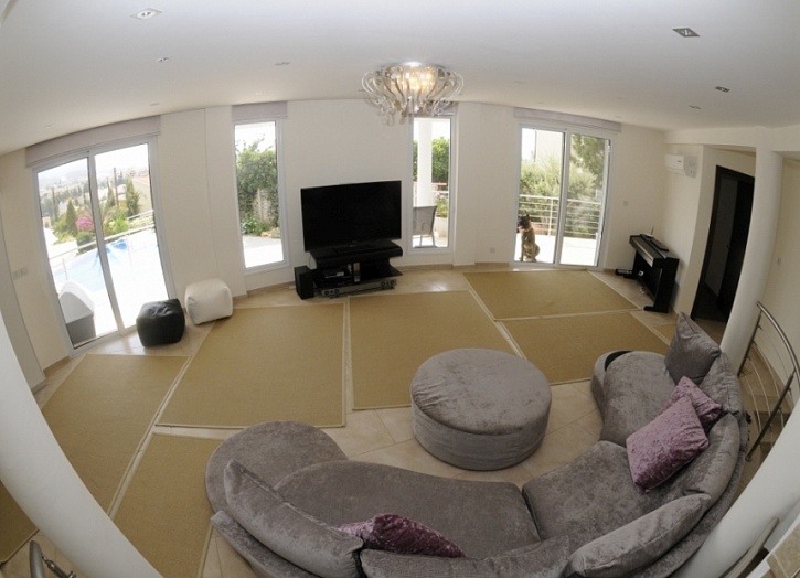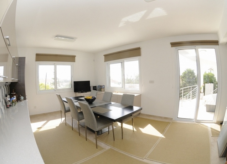 На первом этаже расположена просторная гостиная, отдельная кухня-столовая, спальня (используется как кабинет) и ванная комната. Гостиная выходит на большую полукруглую веранду, откуда открывается прекрасный панорамный вид на Средиземное море.