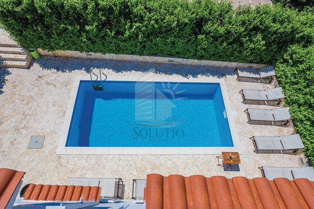 Apartment house for sale with surface of 1000 m2 on a land of 573 m2. House has 4 levels: basement, ground floor, first floor and attic. The facility consists of 6 apartment, parking, swimming pool and furnished garden with barbecue. The apartments have a living room and a kitchen, a bedroom, a bathroom and a balcony and their surface is approximately 50 m2. Apartment in the attic has 100 m2 and two rooms. Basement has approximately 70 m2. Objekt is located 1000 m from the beach and has a beautiful view of the sea.