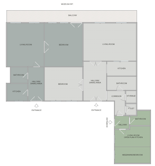The 3rd apartment (86 sqm) consists a hallway with dining area, a fully equipped kitchen, a bathroom with a tub and toilet, a large living room, a large bedroom and a balcony facing Múzeum garden. It has a separate gas heating system.
