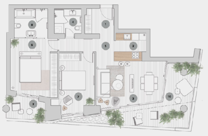 Светлая квартира площадью 110 м² располагается на 3 этаже современного жилого комплекса Dukley Residences. Апартаменты включают в себя две спальни, гостиную, совмещенную с  кухней и террасу с видом на море. С этой высоты открывается прекрасный панорамный вид на море, горы и Старый город.