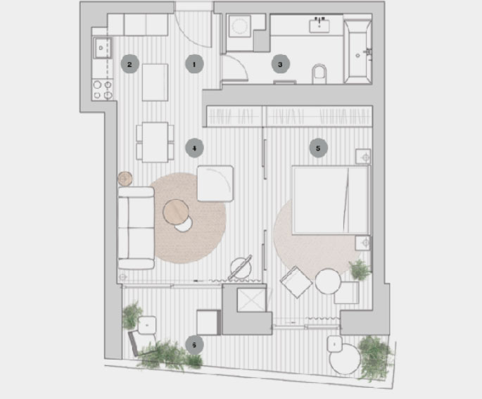 Светлая и просторная квартира площадью 65 м² располагается на 7 этаже современного жилого комплекса. Апартаменты включают в себя одну спальню, гостиную, совмещенную с  кухней и террасу с видом на море. С этой высоты открывается прекрасный вид на море и Старый город: владелец апартаментов сможет ежедневно любоваться морскими закатами прямо с собственной террасы или из панорамного окна.