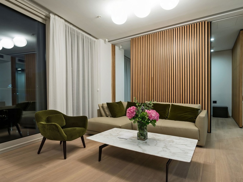 Квартира оборудована системой «умный дом», для отделки использовались натуральные материалы высочайшего качества (камень, металл, дерево). Просторная терраса как нельзя лучше подходят для отдыха, а панорамные окна позволят любоваться восходами и закатами прямо из апартаментов, не выходя на свежий воздух. В разработке интерьеров и экстерьера комплекса принимали участие лучшие европейские дизайнеры и студии. В апартаментах оборудованы теплые полы, установлено кондиционирование и даже настроен автоматический полив цветов, так что хозяину потребуется прикладывать самый минимум усилий, чтобы содержать апартаменты в порядке.