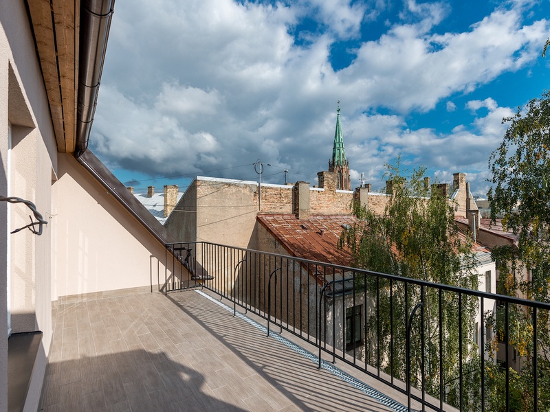 Art-Nuovo как стиль жизни. Изысканная 2-х комнатная площадью 81,6 кв.м. с высококачественным ремонтом и террасой, с видами на крыши Риги, для ценителей неповторимой атмосферы центра города и исторического шарма югенд-стиля в реконструированном домовладении на улице Сколас 20.