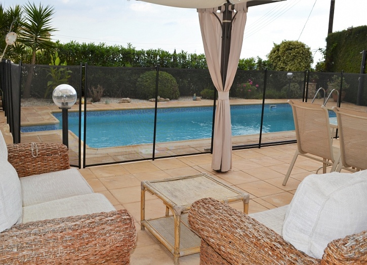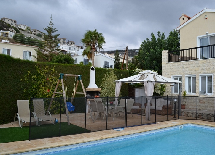 На территории виллы расположены бассейн, зона барбекю, детская площадка, крытая терраса, ухоженный сад.