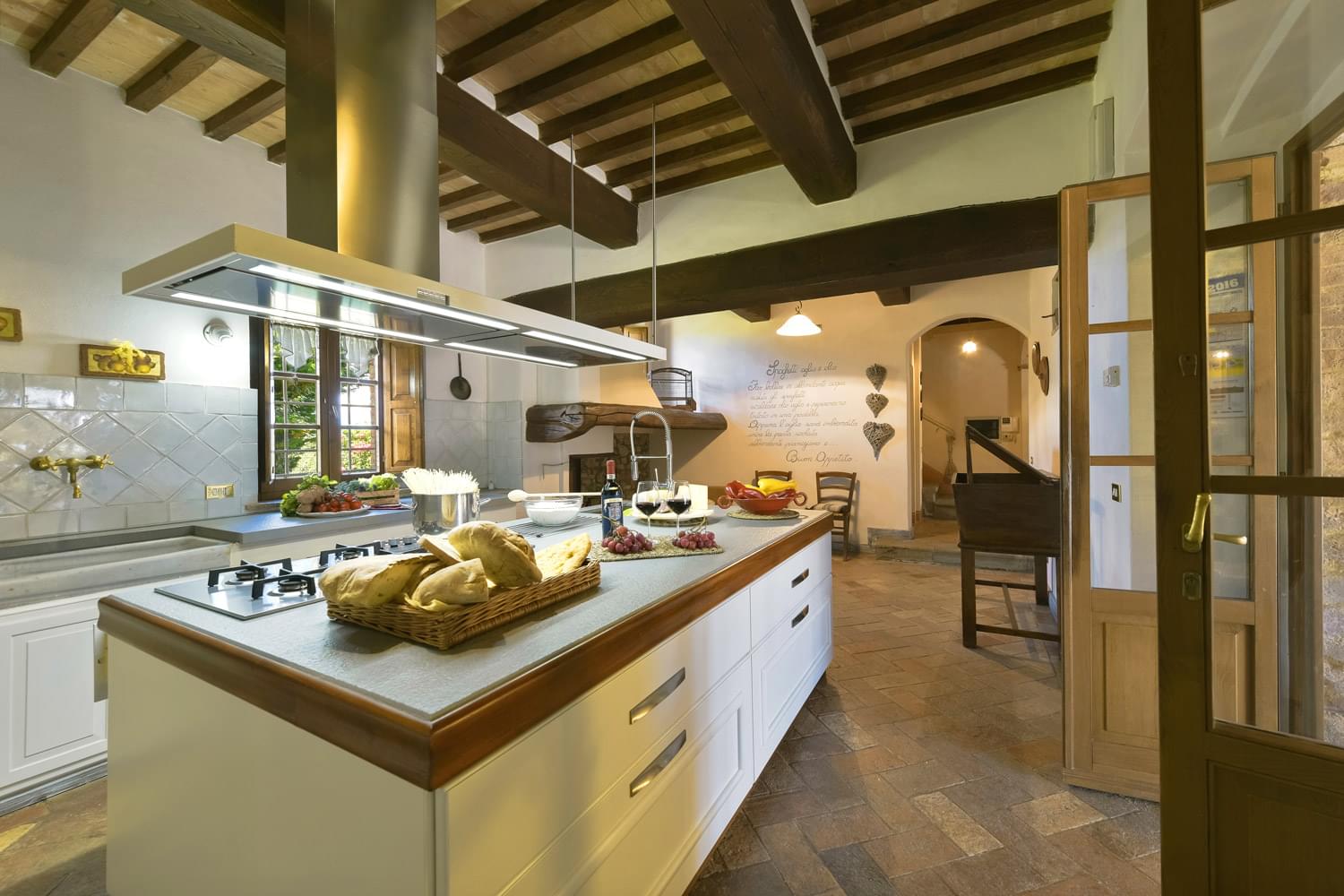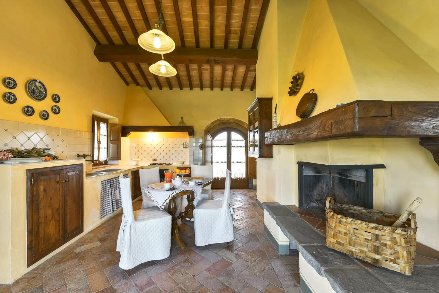 Ground Floor: On the ground floor the villa welcomes you in a fantastic veranda with huge glass walls which make the dining room very bright. The dining room is connected to the big living room which is a real example of Tuscan style architecture with a sequence of brick arch and fire place. A pleasant susrprisa is the kitchen which has been recently renovated in a more modern style, where modern and traditional styles mix perfectly.