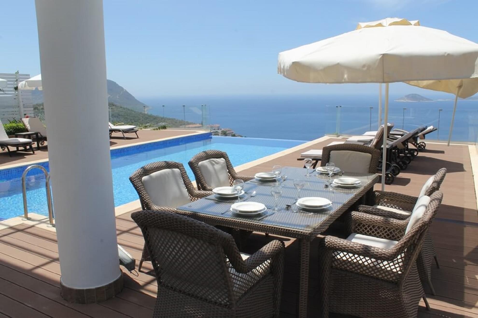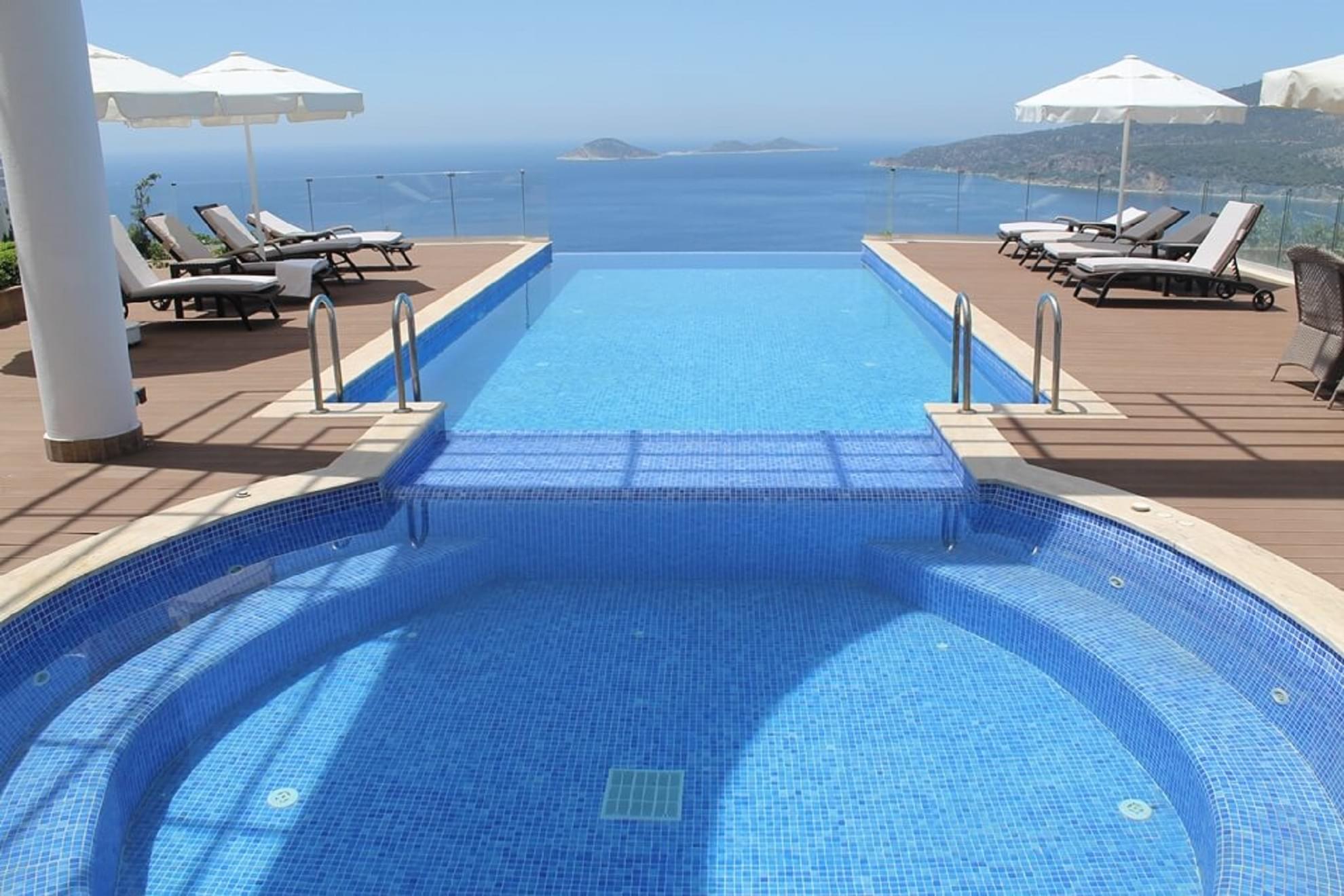 Outsides features a large patio area with views over the Mediterranean Sea from the Turquoise Coast which mere 5 minutes drive away. Also included is a large pool with a jacuzzi with convinient built in seating.
