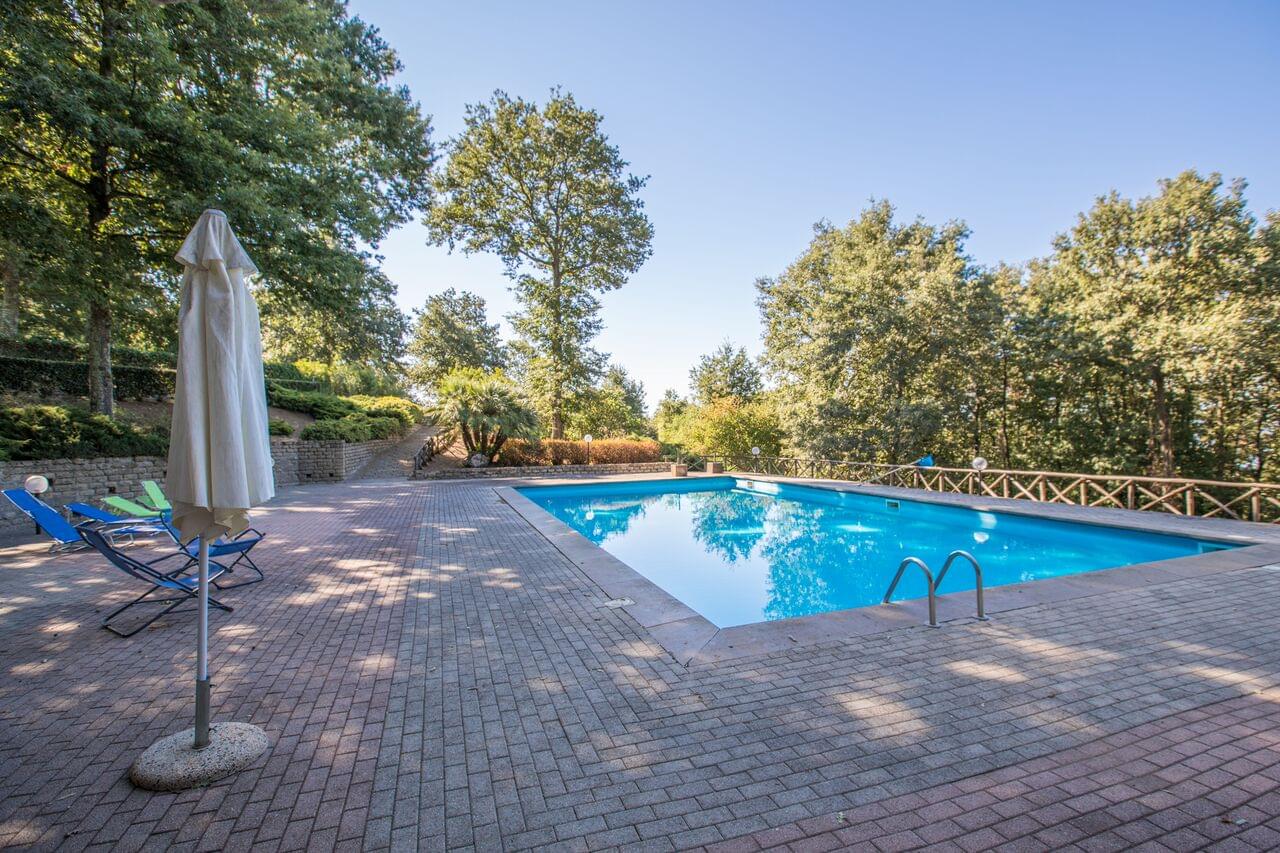 High quality, secluded and large swimming pool and area, exclusive and private. Changing area with toilet and shower, poolside pizza oven.