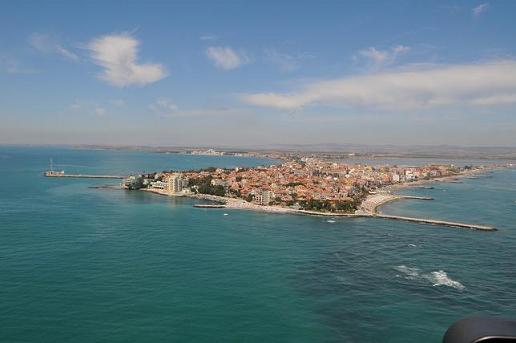 Поморие находится в 18 км от города Бургаса и в 20 км южнее современного морского курорта Солнечный Берег.