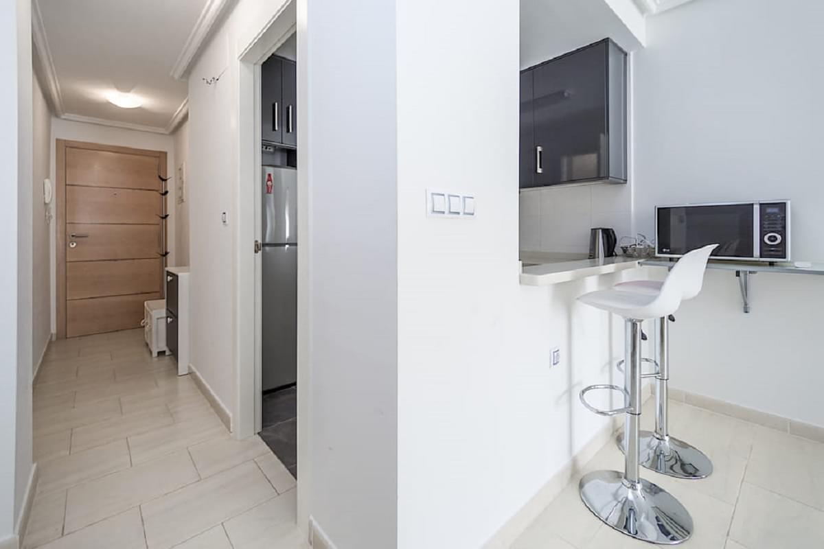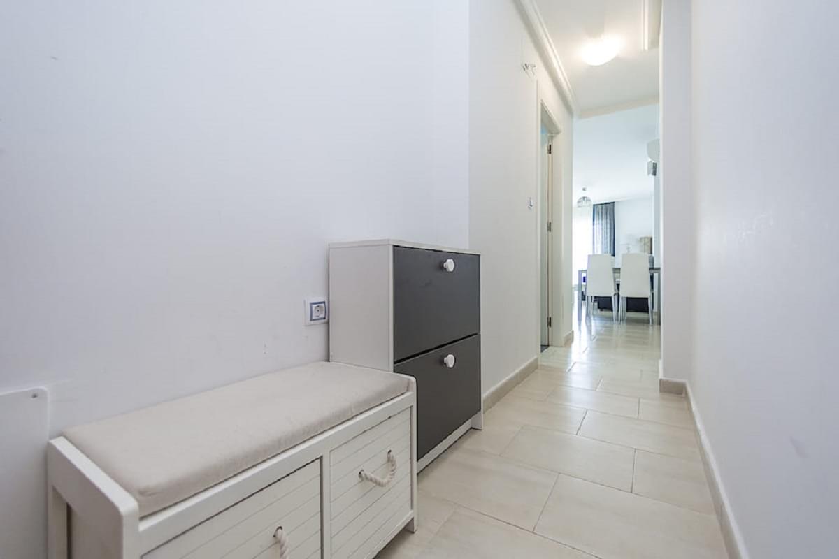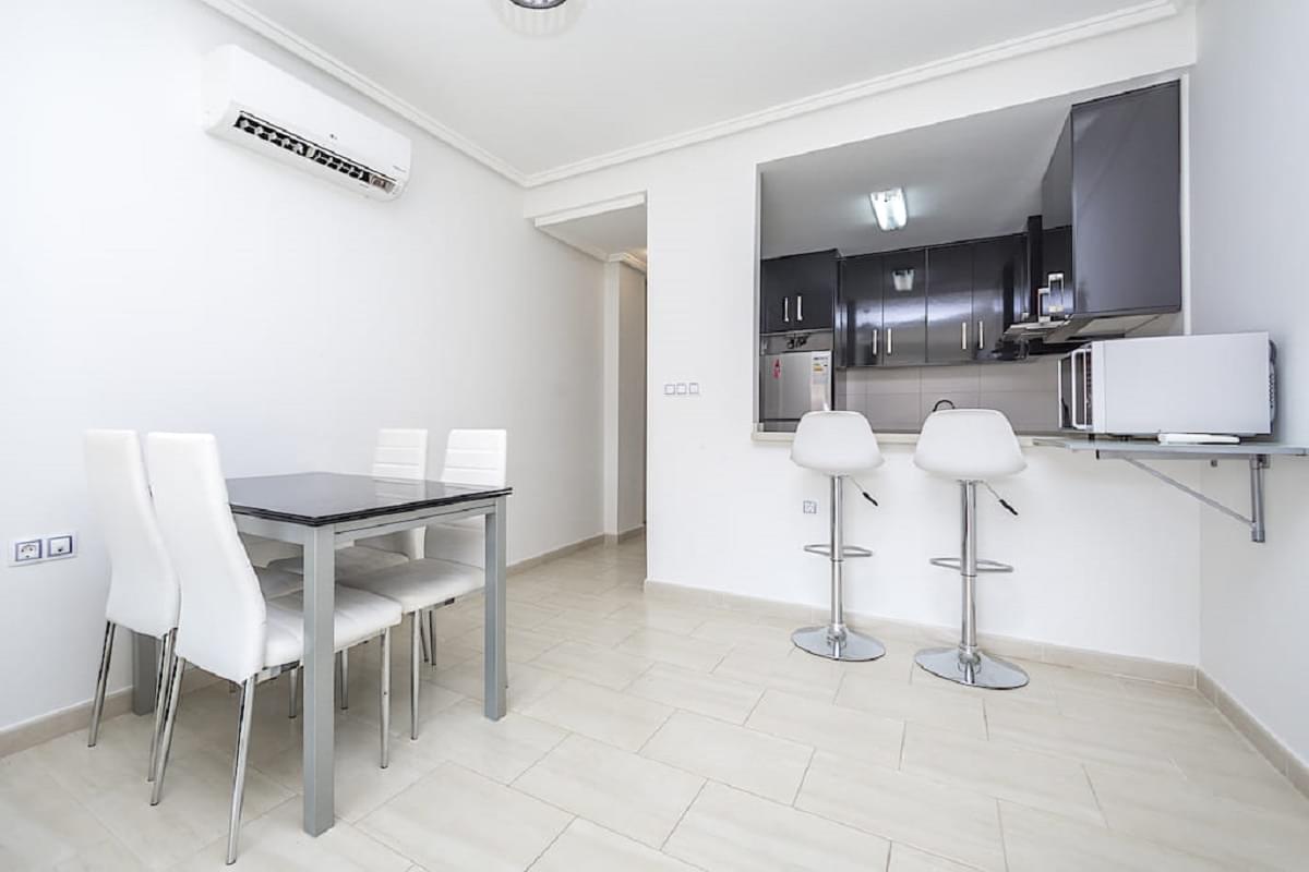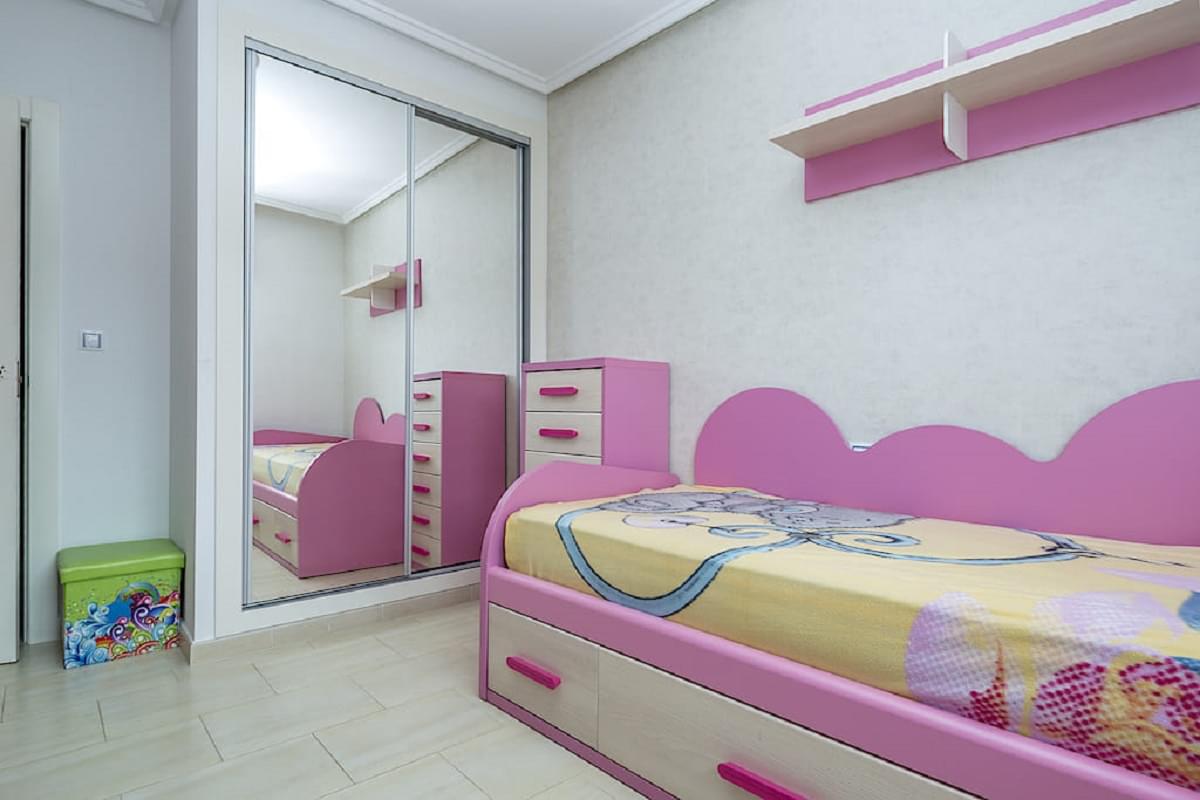 Квартира в Торревьехе достаточно просторная — 65м² с удачной панировкой: большой светлый салон с выходом на террасу 12м² и обеденной зоной, полностью укомплектованная кухня современной бытовой техникой (керамическая варочная поверхность, посудомоечная машина, мощная вытяжка, стиральная машина, холодильник с морозильной камерой, чайник, микроволновая печь) и мебелью. В главной спальной комнате двуспальная кровать и гардероб для хранения вещей плюс собственная ванная комната. Вторая комната также со встроенным шкафом-купе. В квартире есть еще одна гостевая ванная с душевой.