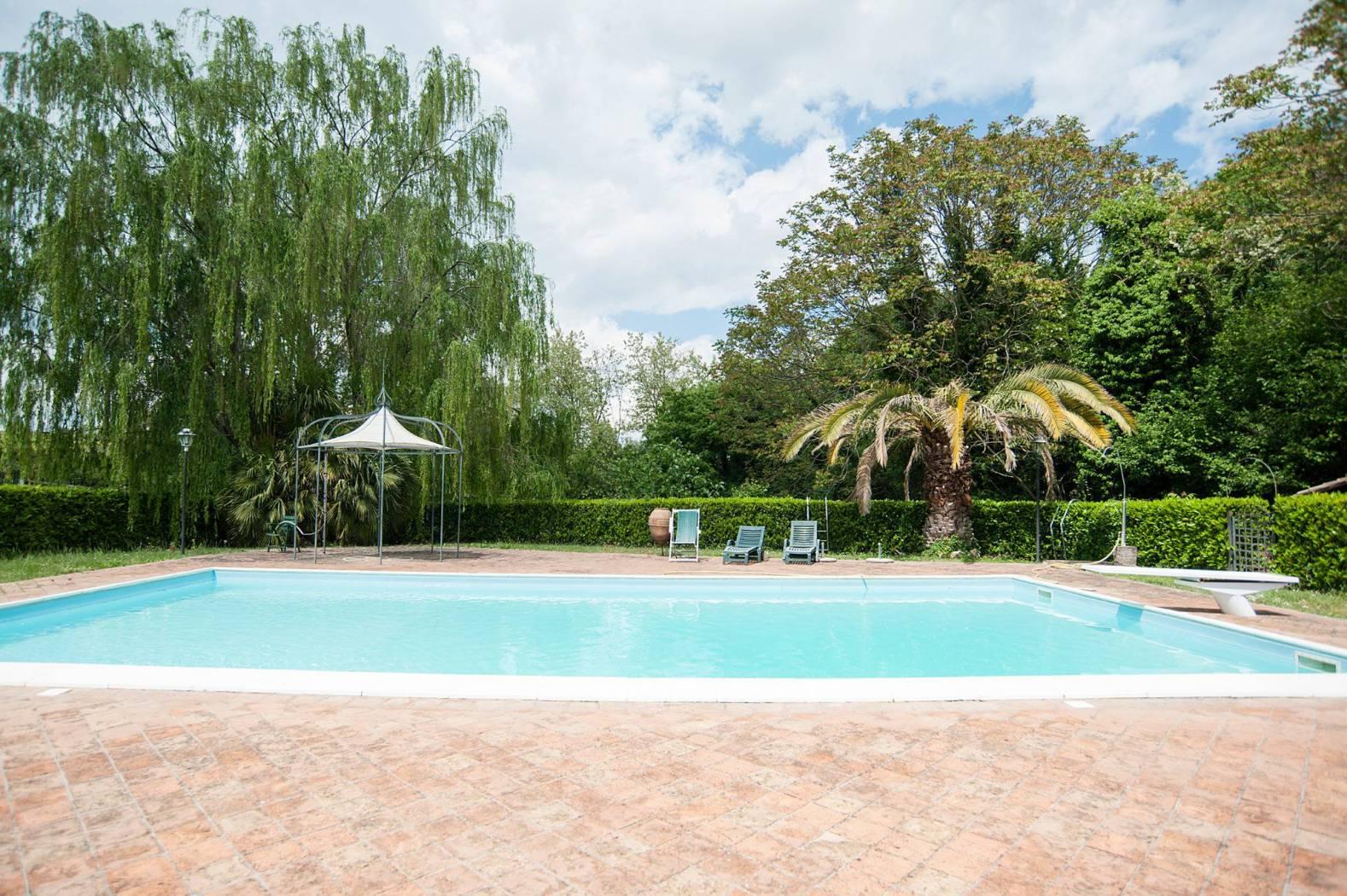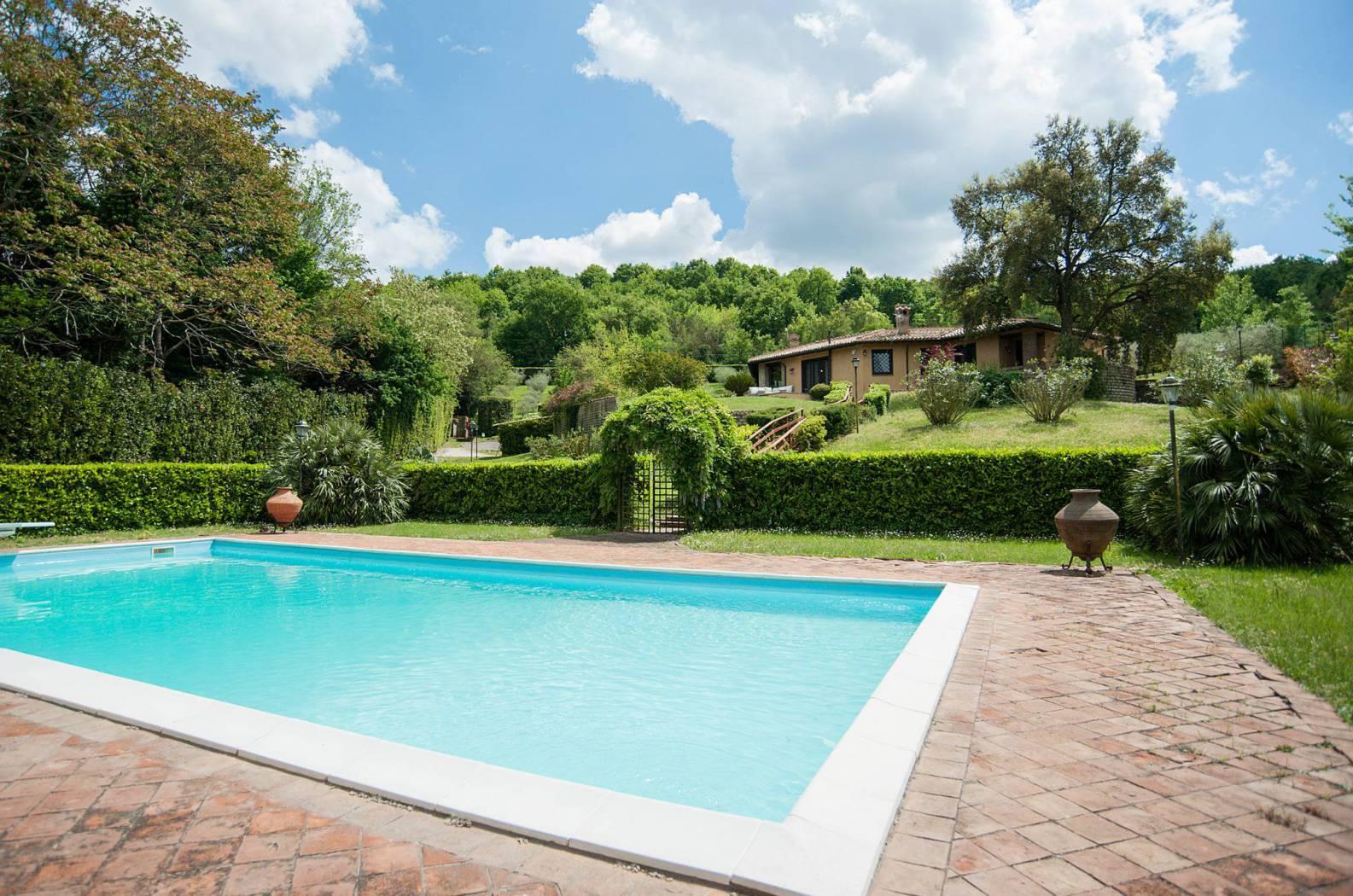 Located in the green, on the beautiful hills between Campagnano and Lake Bracciano, in complete tranquility but not isolated, very close to the Cassia bis.I propose for sale an elegant detached villa with a well-kept surrounding park of 12,000 square meters, enriched by ornamental plants, fruit trees, more than 80 centuries-old olive trees and a large cork tree that gives pleasant shade on hot summer days and a beautiful swimming pool to enjoy moments of relaxation.