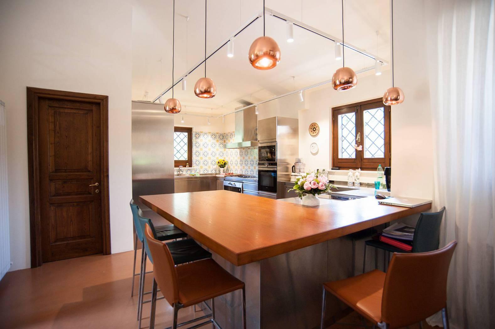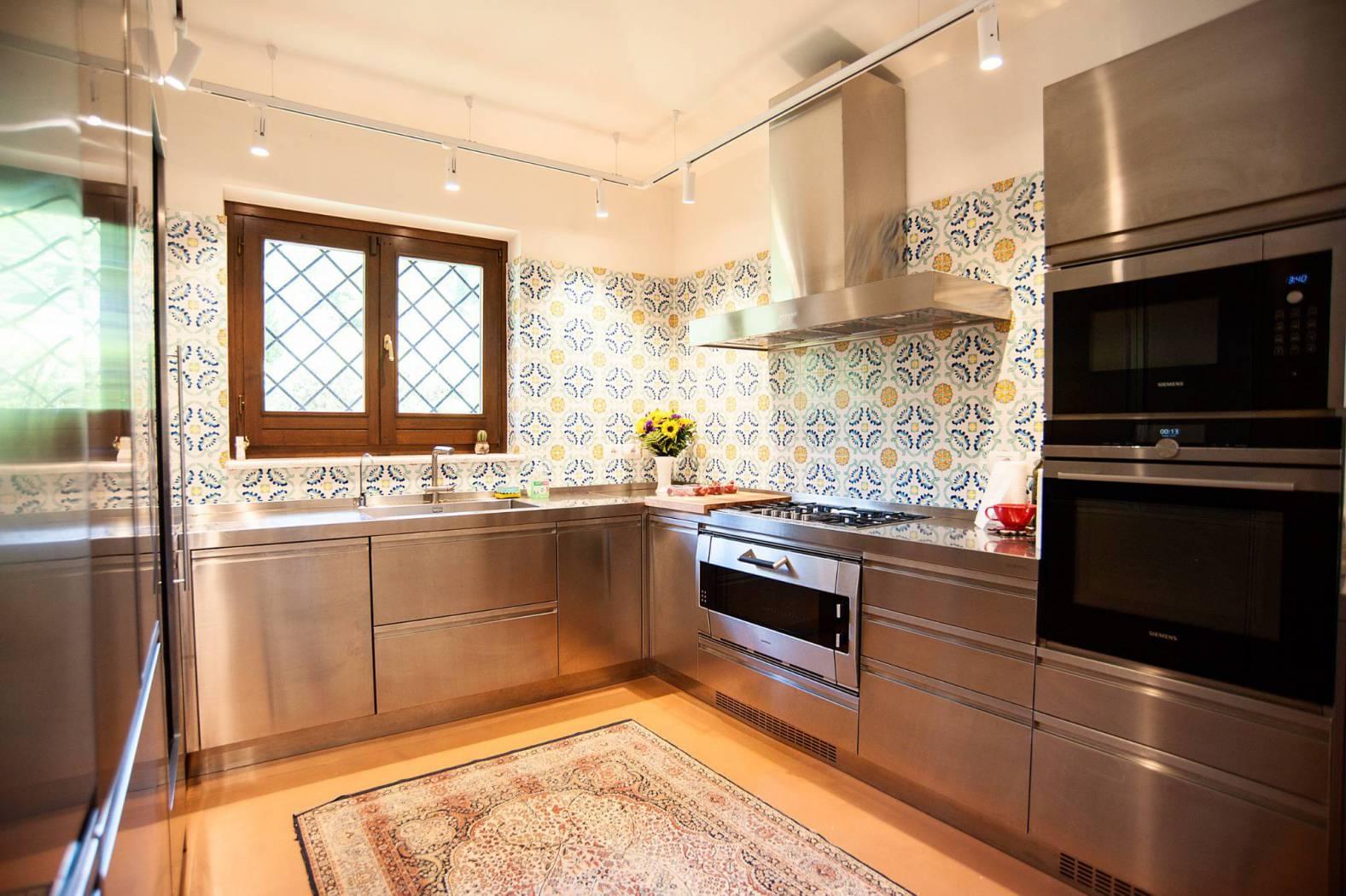 Здесь же находится удобная, современная, оборудованная по последнему зову техники кухня, сделанная на заказ, и прачечная.
