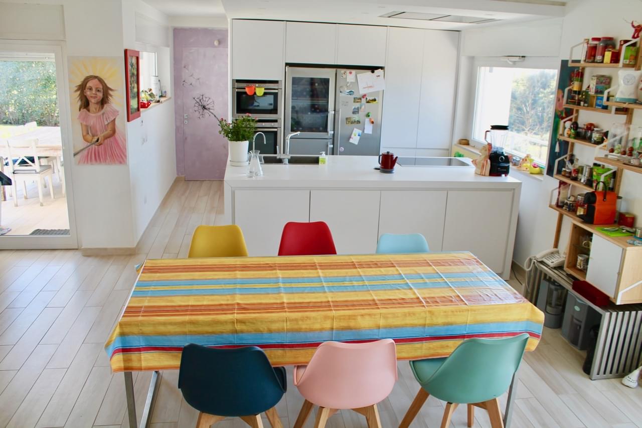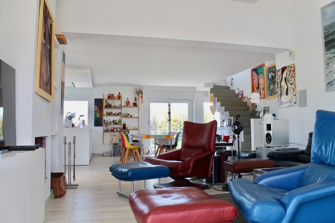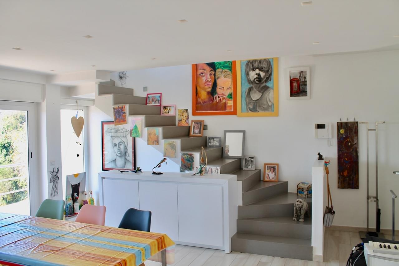 On the ground floor there is a bright living room with a fireplace, a dining room and a fully equipped open kitchen with panoramic windows and access to the open-air veranda, as well as a bathroom and a home-office.