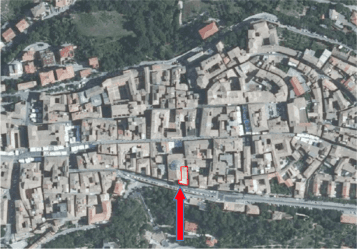 Wie auf dem Plan zu sehen ist, ist der südliche Teil der Fenster der Via 5 Torri zugewandt, während die nördliche Fensterfront in die Via Acqua blickt. Im hinteren Teil der Wohnung befinden sich Räume, die allgemein als Abstellkammer (SGOMBERO) bezeichnet werden und durch tragende Strukturen und Fundamente des Theaters begrenzt sind. Die Abstellkammern haben eine auffällige Architektur mit Kreuzgewölben und Backsteinsäulen, die direkt auf dem typischen Felsen ruhen, auf dem Osimo gebaut ist, dem sogenannten “Tuff".