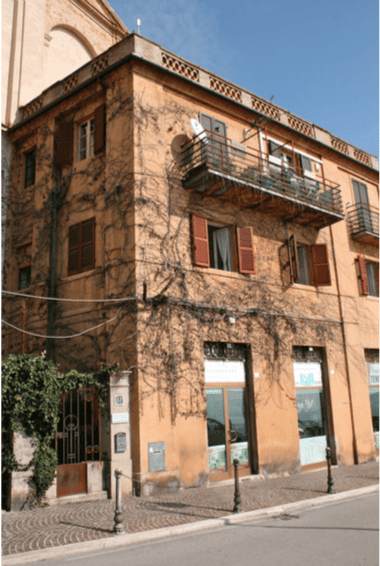 Die Wohnung ist zum Teil im Gebäude des historischen Theaters “La Nuova Fenice” integriert, zum Teil ist sie eine Erweiterung davon. Ein Eingang ist in der Mitte des sogenannten “Vicolo del Teatro” (Theatergasse), oder “Scalette del Teatro” (Theatertreppe), heute Via Acqua. Der andere Eingang ist im unteren Geschoss in der Via 5 Torri Nr. 57. Besonders zu beachten ist der einzigartige und kostbare Putz, mit dem die Südfassade des Gebäudes bedeckt ist. Es handelt sich um einen robusten Mörtel mit Glimmerflocken: ein Beweis für die beste Bauweise der 1930er Jahre. Im Erdgeschoss in der Via 5 Torri befinden sich drei Räume: Z.Zt. werden sie als Abstellkammer und als Geschäfte benutzt. Die drei Räume könnten auch als Garage benutzt werden. Sie sind auch zu verkaufen, obwohl sie nicht direkt zur Wohnung gehören. Die Wohnung ist in Nord- Südrichtung ausgebaut.
