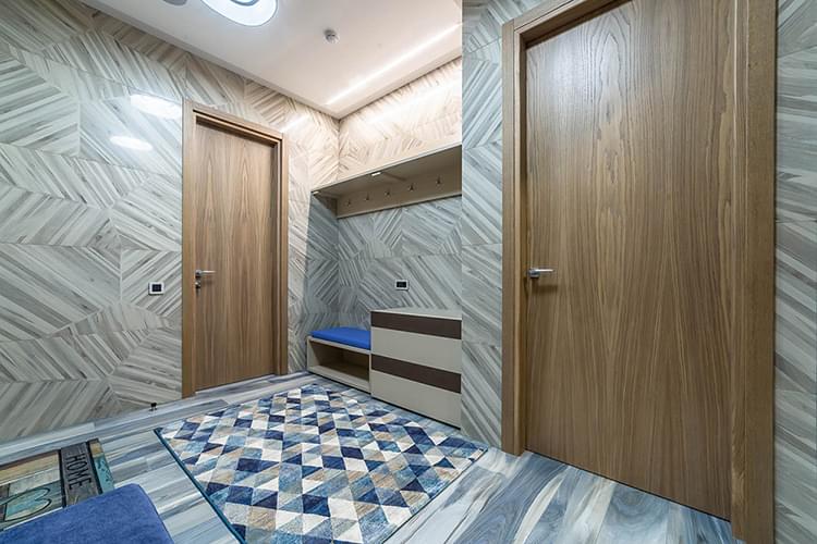 Холл. Стены отделаны керамогранитной плитой из последней коллекции LA FABBRICA (Италия). Удобно расположенные полка для обуви, тумба с выдвижными ящиками для хранения различных мелочей и открытой вешалкой для одежды и шляп , которая заботливо разработана архитекторами и изготовлена на фабрике PREZOTTO (Италия) Можно подчеркнуть, что все элементы мебели, светильники сантехническое оборудование, все отделочные материалы, ковры, текстиль сделаны в Италии вплоть до электрической бытовой техники.