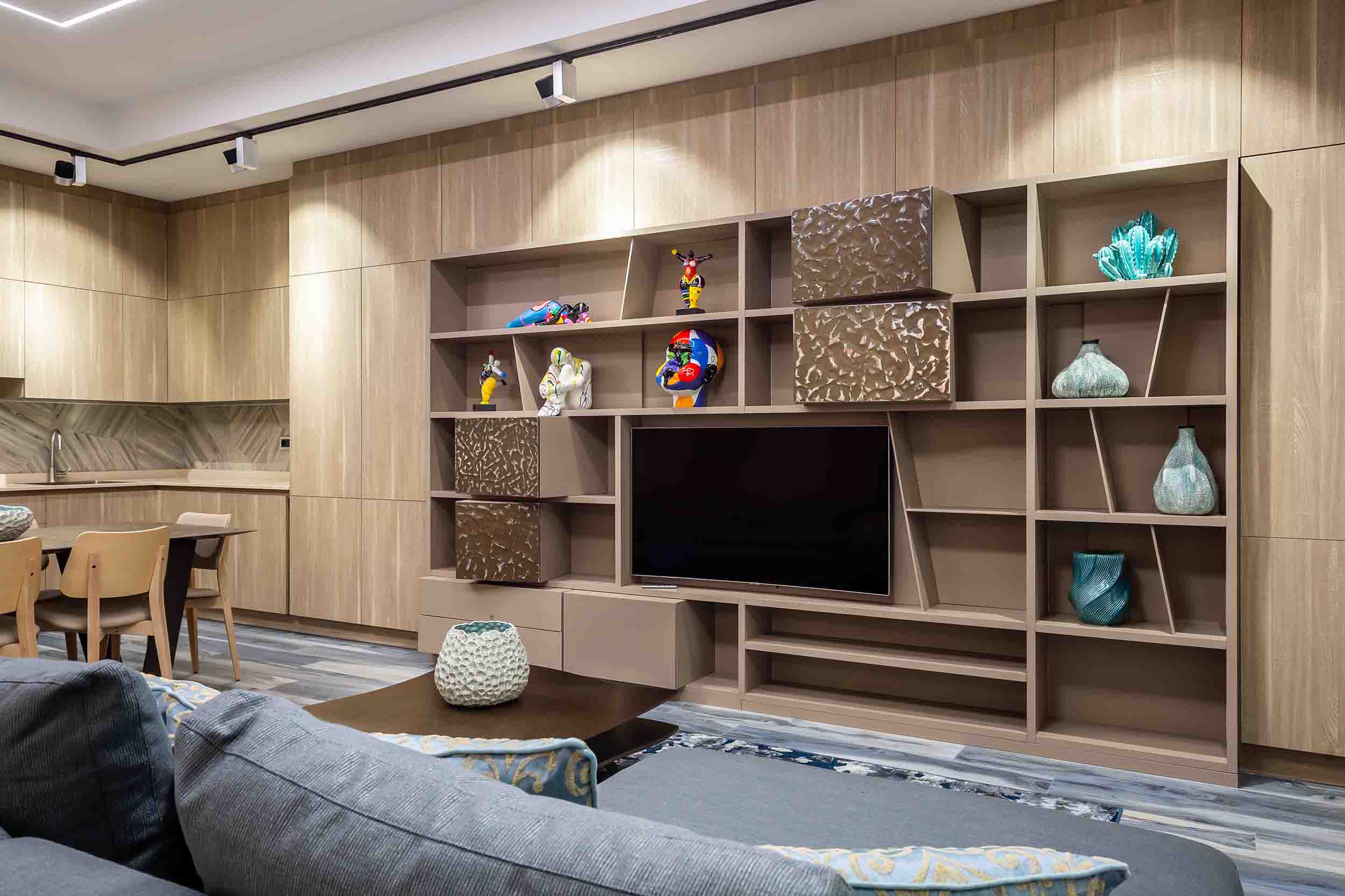Гостиная восхищает чистыми прямыми линиями кухни TREO CUCHINE (Италия) и стенкой для ТВ фабрики PREZOTTO (Италия) . Две фабрики объединились в эффектную композицию благодаря професиональным расчетам архитекторов и грамотному исполнению Итальянских производителей. Привлекает внимание отделка стенки под ТВ самой последней коллекции, представленной на Миланской выставке 2018 года декоративными панелями PANNEGGIO. Дизайнерский стол и стулья также их последней коллекции PREZOTTO (Италия). Диван Итальянской фабрики ALBERTA SALOTTI, известной во всем мире своим современным дизайном. Удобство дивана вы сразу почувствуете как только присядите на него. Ковёр из бамбукового шёлка производства SIT UР (Италия). Ткани штор фабрики RUBELLI (Италия).