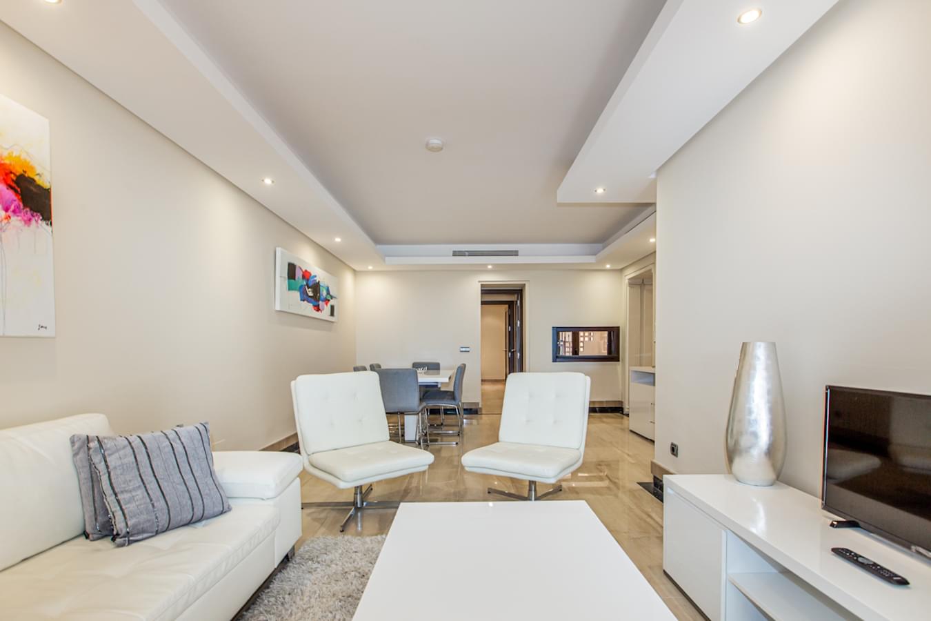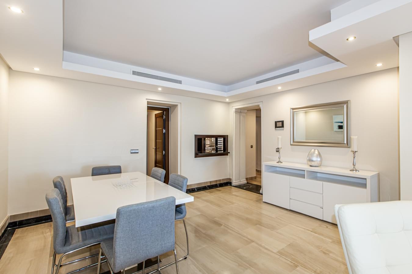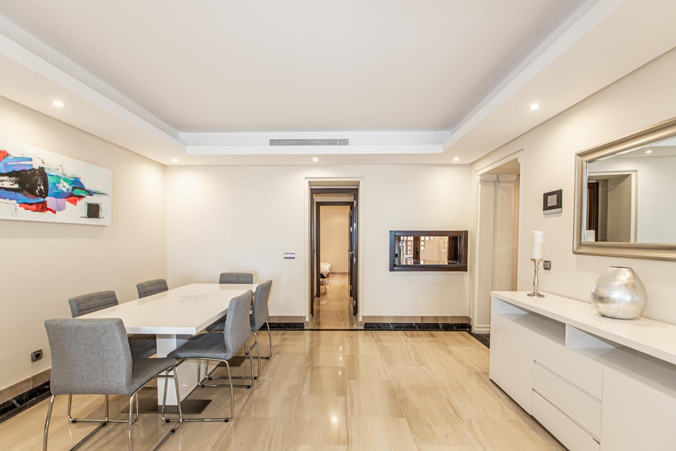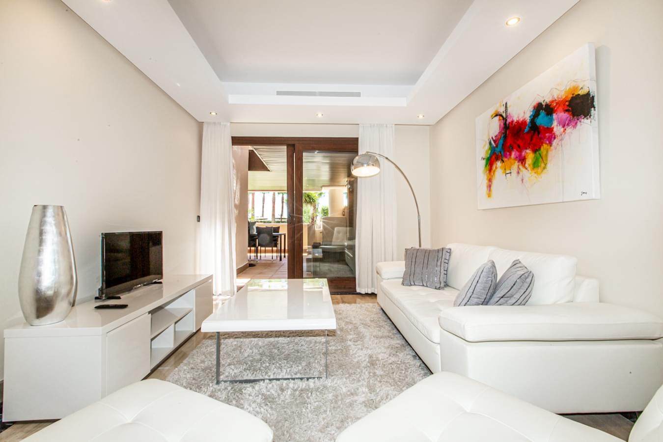 Exclusive apartment built and equipped with top quality materials and luxury finishing including Marble Flooring, Domotics and Full Equipped Kitchen with Granite Worktop, among others. This stunning 2 Bed, 2 Bath Apartment on the Ground Floor offering great privacy. HIGH RENTAL POTENTIAL. Situated in the newly built luxurious beachside development next to the Kempinski Hotel and the fashionable Laguna Village, between the internationally known Puerto Banús in Marbella and Estepona called the New Golden Mile, with a boardwalk that will connect you to Estepona in a few minutes walk, where you will find all kind of amenities and leisure areas, and 5 minutes drive to the nearest Golf course. This privileged and quiet Urbanization offers illuminated tropical gardens and 2 outdoor swimming pools for adults and children, with leisure areas where you can find a heated indoor pool, Gym, Spa, covered paddle court with glass walls and indoor space for social activities as well as direct and exclusive access to the beach make the apartment an ideal solution for first residence as well as to enjoy a second holiday residence with unique landscape and fantastic rental potential. The access to the complex is controlled at all times by a security booth. Private parking and storage room included.
