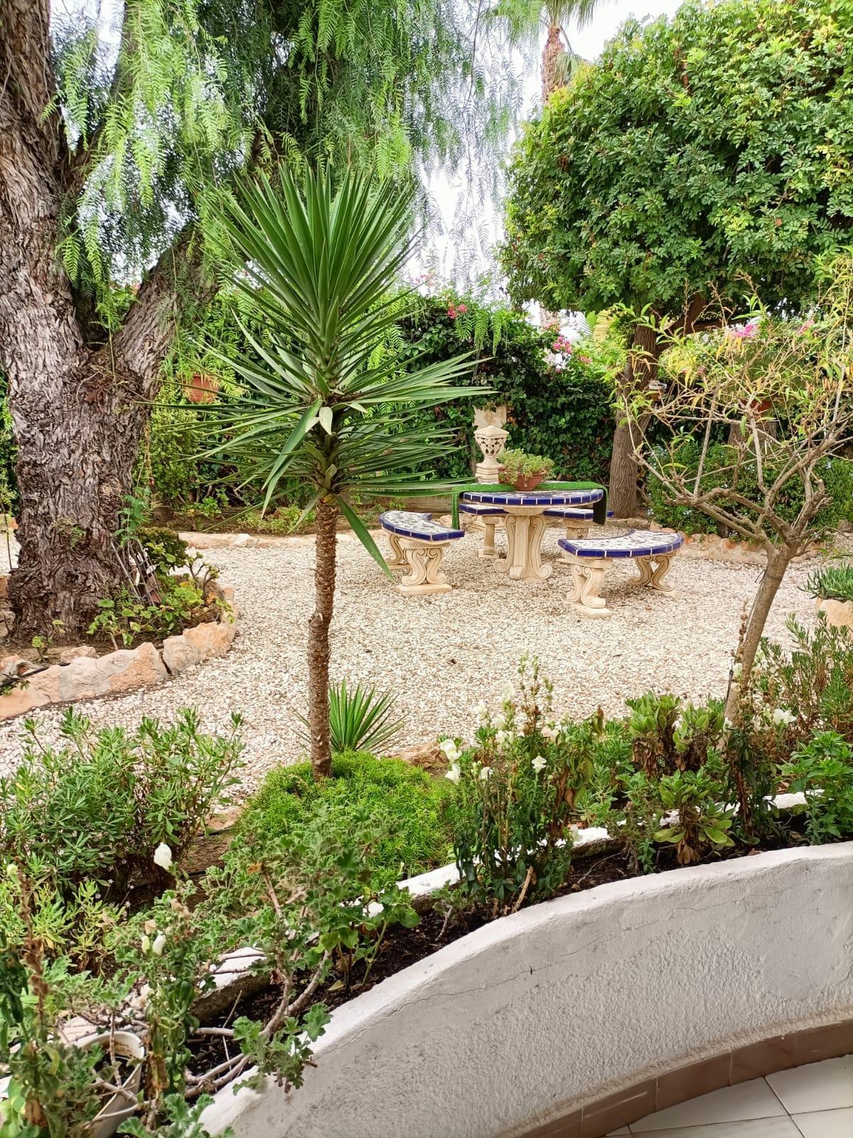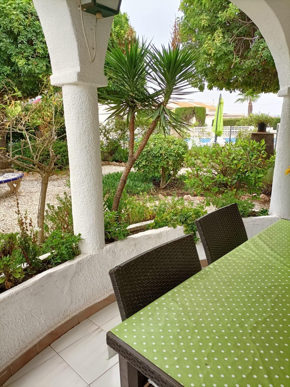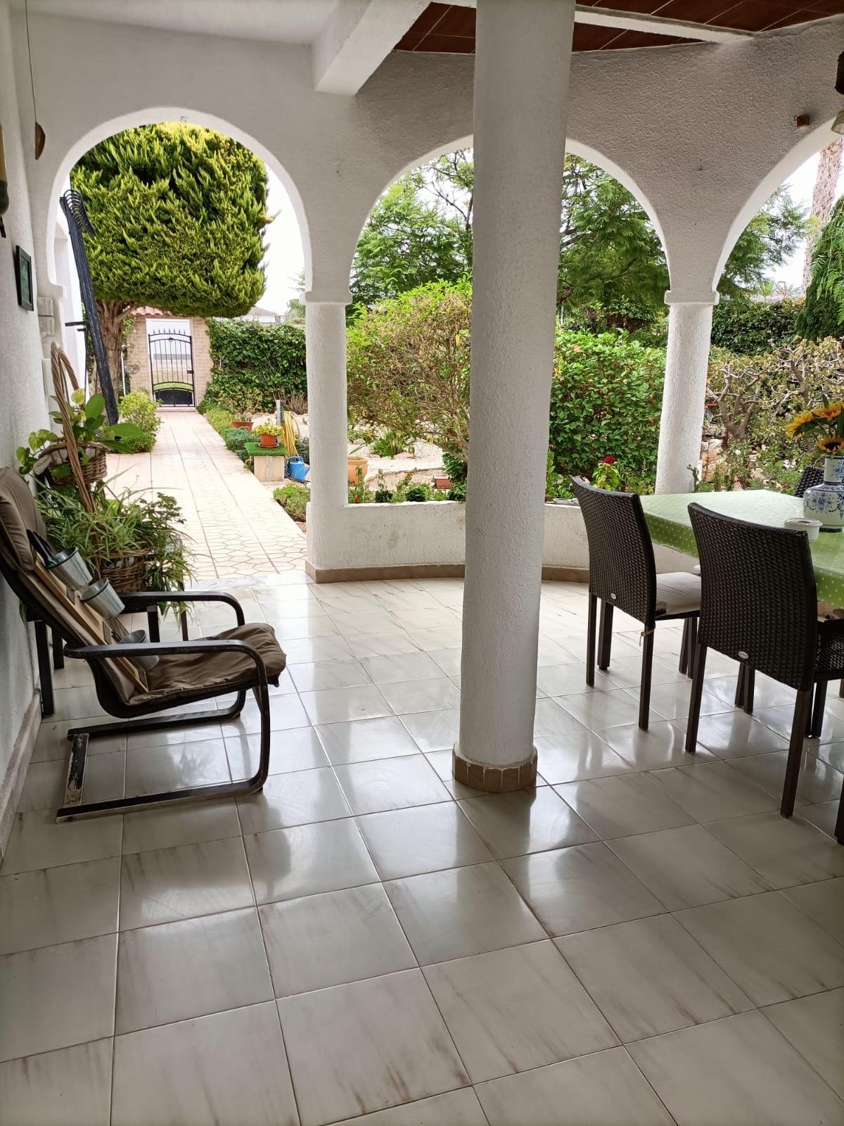 Single storey 4 bedroom villa on a plot of approximately 900 m2 in the quiet urbanization of Torreta Florida, on the outskirts of the city of Torrevieja with all its services, commerce, transport, schools, hospital and just 5 minutes from Acequion beach, the promenade and the Harbor away. The villa of approximately 150 m2 has a covered veranda, a large living room, kitchen, 3 bedrooms, 1 bathroom and storage room. On the property there is a building (as a guest house) with one bedroom and guest toilet, garage and solarium with a view of the salt lake and the area. The rest of the property is landscaped with green areas and terraces. The villa has heating and air conditioning. Part of the property is paved with gravel and is easy to maintain. You can also enjoy the beautiful communal pool. It is sold fully furnished and equipped with all appliances. IDEAL for living all year round!