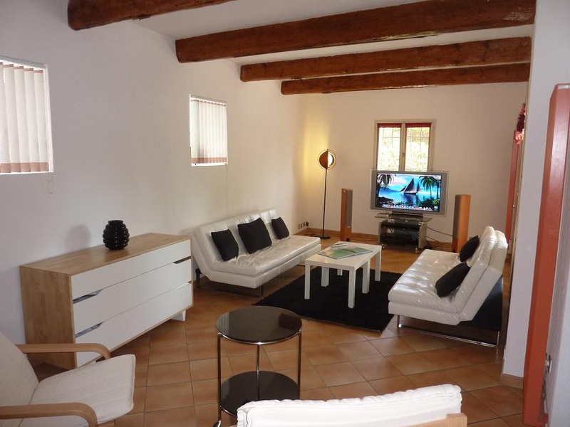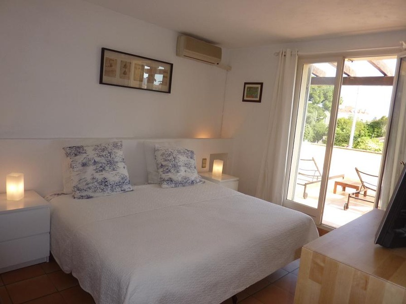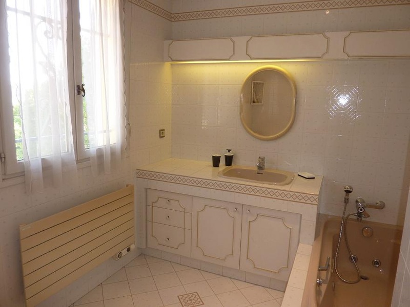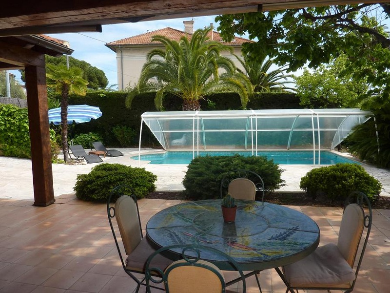 1 km from the Palace of the Festivals and the Croisette, little beautiful villa situated on a ground of 500m². Private swimming pool with steps (8m x 4m, Depth 120/200 - Alarm). Beautiful terrace with garden furniture and sun loungers. Shops, restaurants, supermarket 600m. Sandy beach 1 km. 2-floor villa of 120m²: Living/dining room with 2 divans- bed, Tv(Internet), DVD. Fully-equipped open kitchen. Shower room/WC. Laundry with washing machine and dryer. Office. Upstairs: Master bedroom with air conditioning with 1 double bed (2x90), TV, bathroom (balnéo)/WC, exit to the solarium. 1 bedroom with 1 big bed (140), shower room/WC. Garage 1 car. Parking 2 cars.