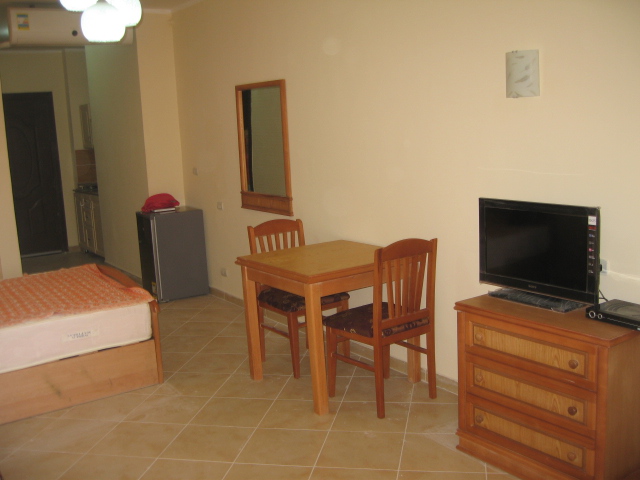 Studio for rent in a new residential complex in Florence Khamsin Beach (Florenza Khamsin Beach) right on the beach in Hurghada. The complex is located in the Arabia area, surrounding hotels - Arabia, Zahabia, El Palacio. Front of the complex at a distance of 20 meters - private beach (now wild, without sunbeds and umbrellas). Have the opportunity to visit the public beach is 400 meters from the complex. The studio is located on the second floor has a view of the outside. The studio is well equipped to stay - there is a large double bed, and an additional two beds - sofa bed. Surround built-in wardrobe, full set of appliances - air conditioning, water heater, television, refrigerator, stove, electric kettle, washing machine. There are dishes, linens, iron. The studio is cozy, clean, brand new. In the courtyard of the complex - spacious grounds with a large swimming pool with children's section, plot of land.